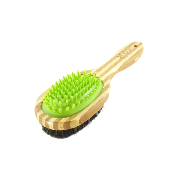 Pawona HOP dvostranska krtača z dvojno funkcijo je zasnovana za dnevno krtačenje in je dovolj nežna, da se uporablja na trebuhu in obrazu psov, ki uživajo v tej izkušnji. Na eni strani ima glavo iz silikona, ki se uporablja za masažo in odstranjevanje dlake, medtem ko je na drugi strani mehka krtača s ščetinami, ki je primerna za vse kratkodlake pse, še posebej tiste s kratkim kodrastim kožuščkom. Stran s ščetinami prav tako pomaga pri enakomernem razporejanju naravnega kožnega olja psa, da ohrani njihovo dlako sijočo in gladko.