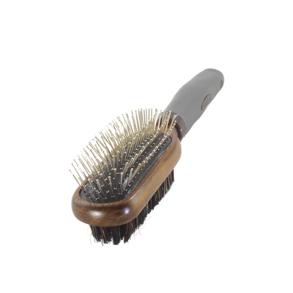 Ko je dlaka razčesana, lahko uporabite stran s ščetinami, ki bodo dlaki vašega ljubljenčka dodala končni sijaj. Stran s ščetinami lahko uporabite tudi za nanos zdravilnih olji za dlako. Dvostranska krtača je odlična kot hitro, preprosto in učinkovito orodje za nego vašega kosmatinca. Krtača ima lesen okvir in gumijast ročaj za boljši oprijem. Na ročaju je tudi luknja na katero lahko namestite vrvico za obešanje.