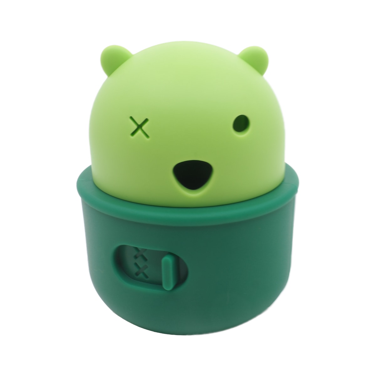Na sprednji strani je gumb s katerim se regulira velikost odprtine glede na velikost priboljškov ali če želite igro otežiti. Igračo enostavno napolnite tako, da zavrtite zgornji svetlejši del, jo napolnite, zaprete in igra se lahko začne. Na voljo je v zeleni barvi. Igrača je visoka 9,5 cm in široka 7,5 cm. Narejena je iz mehkega varnega silikona. Po uporabi igračo sperite s toplo vodo in posušite na zraku.