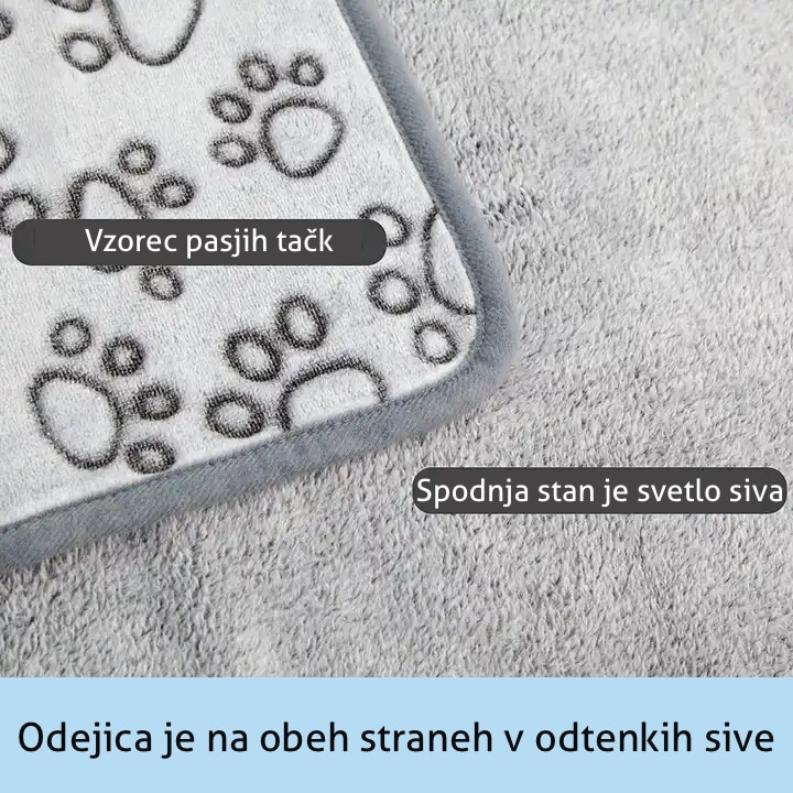 Odejica je izjemno mehka in topla, siva barva z motivom pasjih šapic pa poskrbi, da se odejica poda prav v vsak prostor. Lahko se uporablja tudi kot pregrinjalo na pasji postelji. Odejico lahko perete v pralnem stroju na 30° C.