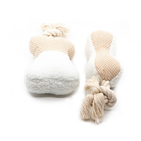 Mehka plišasta kost z vrvjo za crkljanje in prinašanje. Na voljo v dveh oblikah: sploščena kost in kost bolj okrogle oblike.