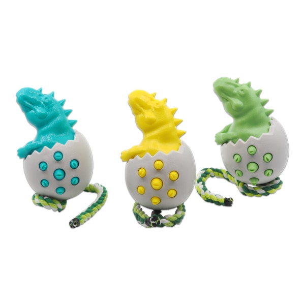Dentalni zmajček v jajčku, trpežen, 17 cm. Dentalna igrača sestavljena iz gume, trše plastike (lupina jajčka) in vrvice, ki predstavlja rep. Konice, ki molijo iz jajčka imajo zarezice, kamor lahko nanesemo kakšno pasjo paštetko in tako podaljšamo čas igre.